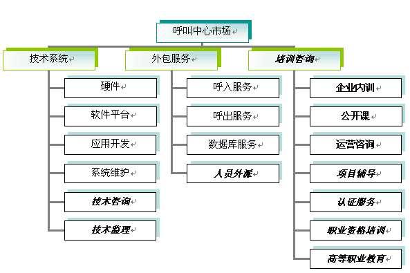 ·從專業(yè)來講,市場將分為客服人員技巧和素質(zhì)培訓(xùn)、管理人員培訓(xùn)、呼入運(yùn)營管理咨詢、電話營銷管理咨詢、技術(shù)咨詢、客服戰(zhàn)略咨詢等不同層面、不同對(duì)象的專業(yè)。市場將出現(xiàn)兩類公司,一類是綜合各個(gè)專業(yè)、提供一體化解決方案的公司,另一類是以某個(gè)專業(yè)為主營業(yè)務(wù)的公司,如電話營銷技巧專業(yè)培訓(xùn)。