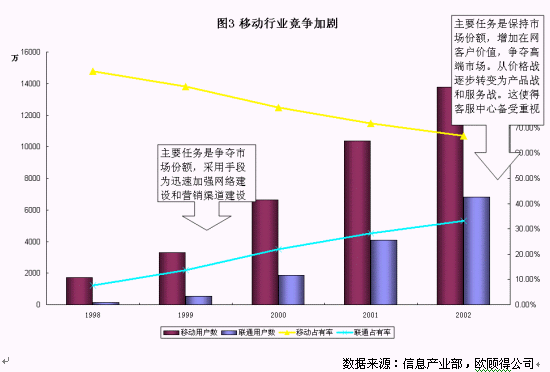 拿移動(dòng)通訊業(yè)務(wù)來說,如圖3所示,截至到2002年底,中國移動(dòng)的市場份額大約在65%,而聯(lián)通為35%左右,網(wǎng)絡(luò)覆蓋以及質(zhì)量也越來越趨同。從國內(nèi)國外的經(jīng)驗(yàn)來看,移動(dòng)通訊市場的競爭正從爭奪市場份額轉(zhuǎn)變?yōu)楸3质袌龇蓊~和增加客戶價(jià)值,而主要手段正也從網(wǎng)絡(luò)建設(shè)、營銷渠道建設(shè)、價(jià)格戰(zhàn)等轉(zhuǎn)變?yōu)楫a(chǎn)品戰(zhàn)和服務(wù)戰(zhàn)。在這個(gè)階段,兩家主要的運(yùn)營公司都對(duì)客戶服務(wù)非常重視。服務(wù)水平的達(dá)標(biāo),投訴流程的梳理,呼叫中心的擴(kuò)大規(guī)模,電話營業(yè)廳的建設(shè)等工作是今年的重點(diǎn)。