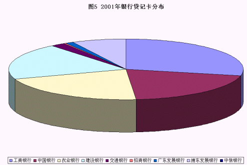 以貸記卡(含信用卡)的發(fā)展舉例:四大國有銀行在2001年還占據(jù)了絕大部分的份額(圖5是2001年貸記卡的分布)。而從2002的下半年起,深圳發(fā)展銀行、招商銀行陸續(xù)推出了頗具市場競爭力的信用卡,廣東發(fā)展銀行等老發(fā)卡行也推出獨(dú)特的女性專用"真情卡"等個(gè)性化產(chǎn)品,對(duì)整個(gè)市場有著很大的沖擊。在信用卡發(fā)卡量迅速提升的情況下,工商銀行2002年貸記卡的數(shù)量比前一年減少了160萬張,這也說明了市場競爭的殘酷。