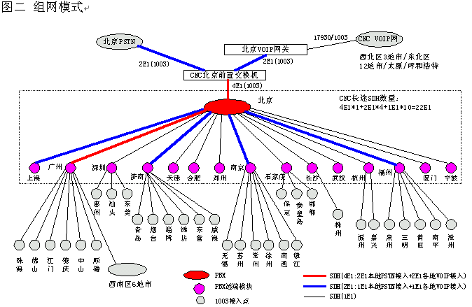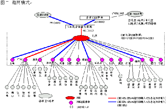 網(wǎng)通的客戶服務(wù)系統(tǒng)(1003呼叫中心)包括位于北京總部的總中心及其它全國30多個城市的分中心,全國范圍共有近200個接入點(覆蓋城市),共有200余座席,由總中心,交換機遠(yuǎn)端模塊接入點子中心及軟覆蓋接入點組成的三層架構(gòu)。參見下圖一《系統(tǒng)架構(gòu)》及圖二《組網(wǎng)模式》。