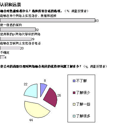 從更為廣泛的層面上看,我們的調(diào)查結(jié)果顯示:三分之一的管理人員對(duì)融合網(wǎng)絡(luò)的益處一無(wú)所知或者知之甚少。困惑的并不僅是高級(jí)經(jīng)理們:分析公司IDC近期對(duì)歐洲600余名廣域網(wǎng)管理人員進(jìn)行的調(diào)查顯示,只有五分之一的人能夠完全了解融合網(wǎng)絡(luò)所實(shí)現(xiàn)的各項(xiàng)功能。
