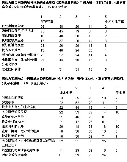 我們調(diào)查的企業(yè)中,有超過(guò)三分之二將在未來(lái)五年內(nèi)實(shí)現(xiàn)大多數(shù)或者所有部門向融合網(wǎng)絡(luò)的轉(zhuǎn)型。大部分企業(yè)采取按部就班的形式在某些特殊部門和業(yè)務(wù)開始部署。在融合應(yīng)用中,IP語(yǔ)音電話將在未來(lái)三年內(nèi)吸引大量投資;管理人士期望通過(guò)大幅削減公司內(nèi)部的通話費(fèi)用獲得早期的回報(bào)。在更廣泛的層面上,大多數(shù)管理者預(yù)計(jì),融合網(wǎng)絡(luò)對(duì)其企業(yè)的商業(yè)影響將會(huì)“非常重要”或者“重要”。