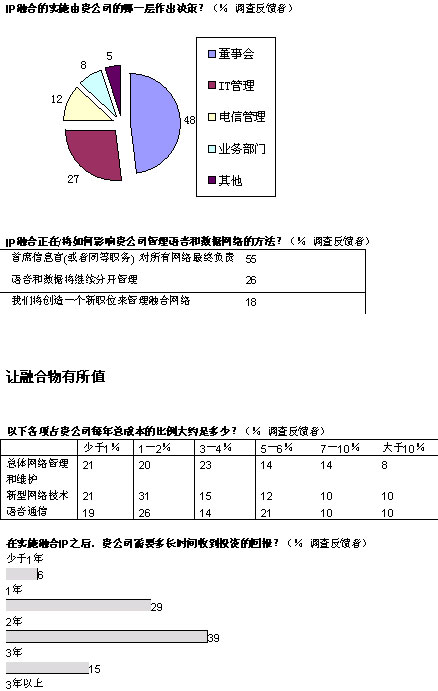 融合網(wǎng)絡(luò)已經(jīng)成為現(xiàn)實(shí)。在經(jīng)濟(jì)學(xué)家信息部展開的全球調(diào)查中,103位高級(jí)經(jīng)理中超過(guò)半數(shù)的人投票表示,他們的企業(yè)已經(jīng)開始實(shí)施IP網(wǎng)絡(luò)融合,還有26%表示他們將計(jì)劃部署。