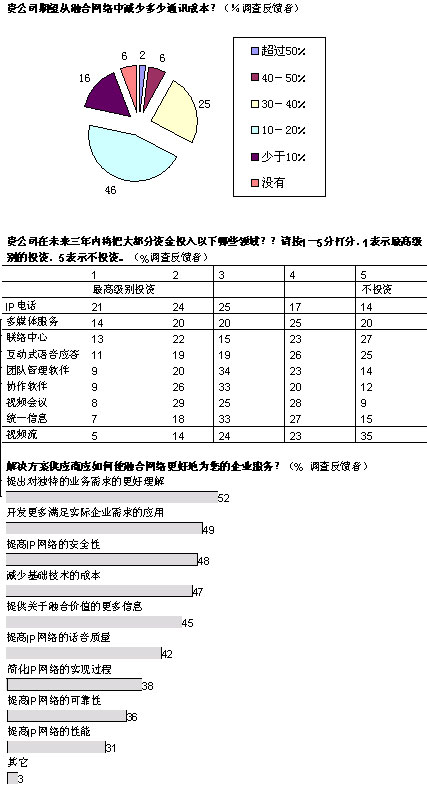 盡管如此,雖然IP融合的真正長(zhǎng)期效益可能有利于提高員工效率,但是投資必須得到公司首席財(cái)務(wù)官的認(rèn)可。在總體網(wǎng)絡(luò)成本中預(yù)計(jì)可以節(jié)約多少?大多數(shù)公司希望削減10%-20%的費(fèi)用,也有相當(dāng)一部分公司期望減少30%-40%的費(fèi)用。上述報(bào)告中提到的實(shí)例中表明,這樣的節(jié)約是可以實(shí)現(xiàn)的。