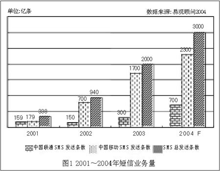 預(yù)計(jì)2004年的短信發(fā)送量將達(dá)到3000億條,其中中國(guó)移動(dòng)為2300億條,中國(guó)聯(lián)通為700億條,具體如圖1所示。并且,隨著用戶(hù)逐漸習(xí)慣使用SMS業(yè)務(wù),SMS用戶(hù)數(shù)占手機(jī)用戶(hù)數(shù)的比例會(huì)略有增加。