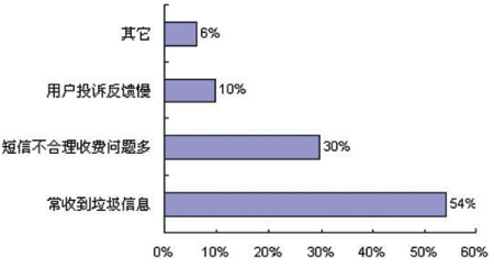調(diào)研結(jié)果顯示,用戶(hù)對(duì)目前經(jīng)常收到垃圾信息表示不滿(mǎn)比例高達(dá)54%;其次是短信費(fèi)用問(wèn)題,用戶(hù)的不滿(mǎn)意見(jiàn)也比較多,例如短信的訂閱與退訂,對(duì)于一些短信費(fèi)用的不合理收取、一些訂閱業(yè)務(wù)無(wú)法取消等等,該比例為30%;另外有10%左右的用戶(hù)對(duì)解決投訴的及時(shí)性和有效性表示了不滿(mǎn)。