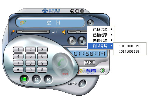 通話記錄很詳細(xì),除了“已撥”、“已接”、“未接”外,還有一項“測試號碼”,可以讓用戶撥打聯(lián)通“寶視通”的服務(wù)熱線測試可視電話是否正常工作,也可以向服務(wù)人員詢問相關(guān)的服務(wù)內(nèi)容。