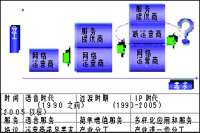 Switch(軟交換)、3G、IPv6等技術進行系統(tǒng)構筑,全面融合先進的語音、數(shù)據(jù)及移動通信IP一體化解決方案,從而為企業(yè)提供不同需求層次的選擇。另外,由此導致產(chǎn)業(yè)結(jié)構也悄悄地發(fā)生變化,產(chǎn)業(yè)朝三層級和多層級演變通信的新結(jié)構和新角色:服務運營商的誕生,網(wǎng)絡運營商向服務提供商的轉(zhuǎn)型。