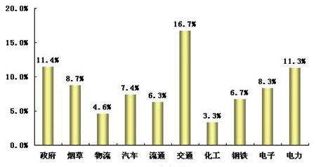 2005年中國主要行業(yè)的大型用戶呼叫中心需求比例平均為8.5%。其中需求比例較高的行業(yè)有交通、政府、電力,這些行業(yè)大型用戶呼叫中心需求比例超過了10%。另外,煙草、汽車制造、流通和鋼鐵企業(yè)呼叫中心需求大致在7%~8%左右。物流行業(yè)和化工企業(yè)需求比例較低。