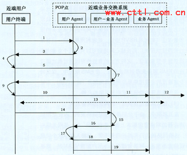 在POP點處,每類業(yè)務(wù)有一個“業(yè)務(wù)Agent”,其生命周期與運營商此類業(yè)務(wù)的生命周期相同,即從運營商開通此類業(yè)務(wù)到運營商終止提供此類業(yè)務(wù)為止,因此“業(yè)務(wù)Agent”基本上是長期存在的!皹I(yè)務(wù)Agent”負(fù)責(zé)對不同用戶的同類業(yè)務(wù)進(jìn)行匯聚,統(tǒng)一與遠(yuǎn)端的“業(yè)務(wù)Agent”進(jìn)行業(yè)務(wù)交互。