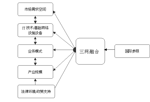 三網(wǎng)融合,需要巨大的市場需求空間、成熟的IT技術(shù)/基礎設施、適宜的業(yè)務模式、可觀的產(chǎn)業(yè)規(guī)模以及良好的政策支持和法律環(huán)境等必備條件的出現(xiàn)。