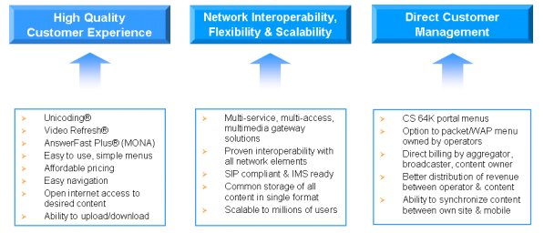 Refresh®和AnswerFast Plus® (MONA的一部分),同時(shí)多媒體網(wǎng)關(guān)解決方案也包括在內(nèi)。其它方面的可互操作性和用戶體驗(yàn)改善問(wèn)題很容易能解決,對(duì)今天現(xiàn)有的WAP服務(wù)是一種補(bǔ)充。
