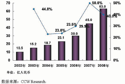 圖 2002—2008年中國視頻會議系統(tǒng)市場規(guī)模