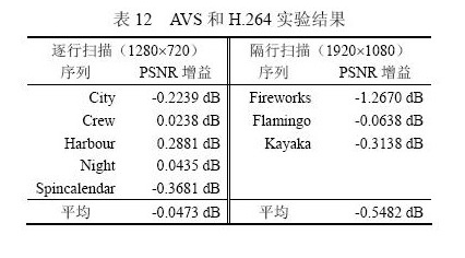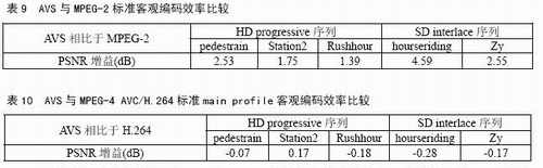 對視頻編碼標準進行客觀評價的常用方法是峰值信噪比PSNR。表9、表10分別給出了AVS與MPEG-2標準以及AVS與MPEG-4 AVC/H.264標準main profile的客觀編碼性能。結果為相同碼率條件下峰值信噪比PSNR的增益?梢钥闯,AVS相對于MPEG-2標準編碼效率平均提高2.56dB,相比于H.264標準編碼效率略低,平均有0.11dB的損失。