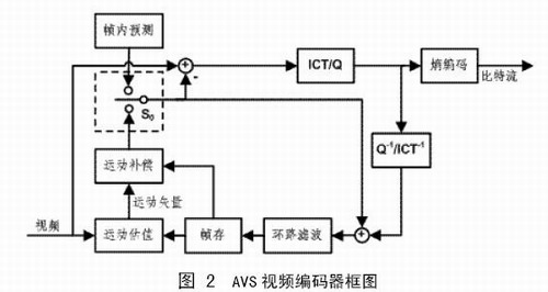 AVS視頻標準定義了I幀、P幀和B幀三種不同類型的圖像,I幀中的宏塊只進行幀內預測,P幀和B幀的宏塊則需要進行幀內預測或幀間預測,圖中S0是預測模式選擇開關。預測殘差進行8×8整數(shù)變換(ICT)和量化,然后對量化系數(shù)進行zig-zag掃描(隔行編碼塊使用另一種掃描方式),得到一維排列的量化系數(shù),最后對量化系數(shù)進行熵編碼。AVS視頻標準的變換和量化只需要加減法和移位操作,用16位精度即可完成。