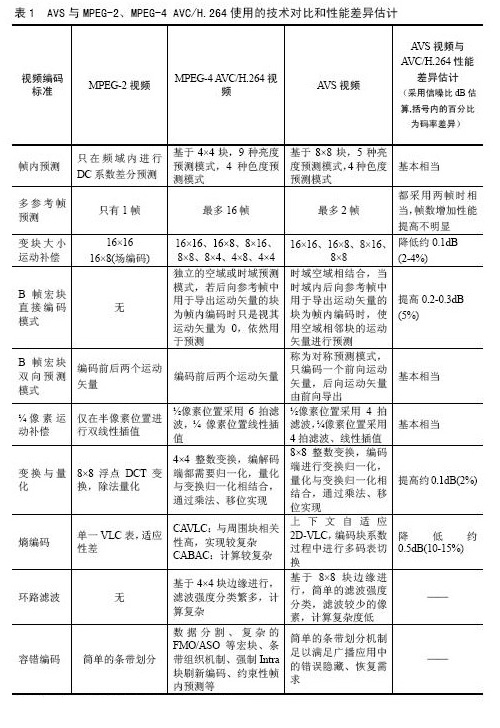 AVS視頻標準(GB/T 20090.2)是基于我國自主創(chuàng)新技術和國際公開技術所構建的標準,主要面向高清晰度和高質量數(shù)字電視廣播、網(wǎng)絡電視、數(shù)字存儲媒體和其他相關應用,具有以下特點:(1)性能高,編碼效率是MPEG-2的2倍以上,與H.264的編碼效率處于同一水平;(2)復雜度低,算法復雜度比H.264明顯低,軟硬件實現(xiàn)成本都低于H.264;(3)我國掌握主要知識產(chǎn)權,專利授權模式簡單,費用低;诖,我們認為AVS標準是能夠支撐國家數(shù)字音視頻產(chǎn)業(yè)發(fā)展的重要標準。
