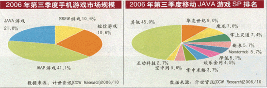 目前,中國手機用戶已經(jīng)突破4億。今年10月,計世資訊發(fā)布的調(diào)查報告說,2006年,中國手機游戲市場規(guī)模將超過18億元人民幣;稍早些時候,易觀國際的調(diào)查報告則顯示,今年中國的手機游戲市場規(guī)模接近22億元人民幣,到2008年時將超過60億元人民幣。在全球,手機游戲市場以每年超過40%的速度增長,已經(jīng)超過音樂和其他無線增值服務(wù),成為未來無線增值服務(wù)的明星業(yè)務(wù)。