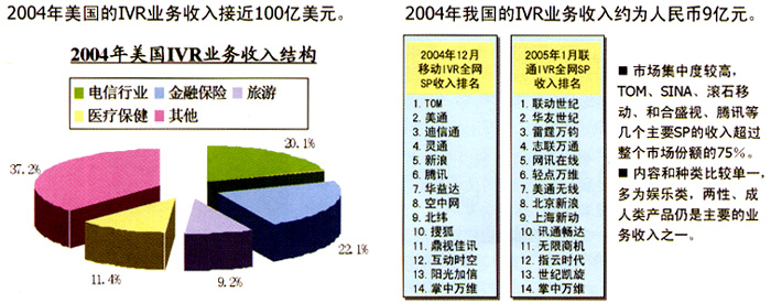 目前,國(guó)內(nèi)IVR的業(yè)務(wù)主要集中于為個(gè)人提供服務(wù)上,行業(yè)應(yīng)用所占比例較小,與成熟的國(guó)外市場(chǎng)以行業(yè)應(yīng)用為主的現(xiàn)狀形成巨大反差。而且,在為個(gè)人提供的語音業(yè)務(wù)中,國(guó)內(nèi)最受歡迎的仍是娛樂信息類中的聊天交友類業(yè)務(wù),這表明國(guó)內(nèi)個(gè)人用戶的需求層次較低;其次是娛樂和點(diǎn)播類的音樂類業(yè)務(wù);第三大類是游戲答題類,例如:知識(shí)競(jìng)猜、有獎(jiǎng)競(jìng)猜、角色扮演游戲、互動(dòng)游戲等;另外,IVR的數(shù)據(jù)業(yè)務(wù),如:短信、彩鈴、彩信等,受到近兩年國(guó)內(nèi)短信、彩鈴業(yè)務(wù)蓬勃發(fā)展的帶動(dòng),近兩年也呈現(xiàn)快速增長(zhǎng)的良好勢(shì)頭。