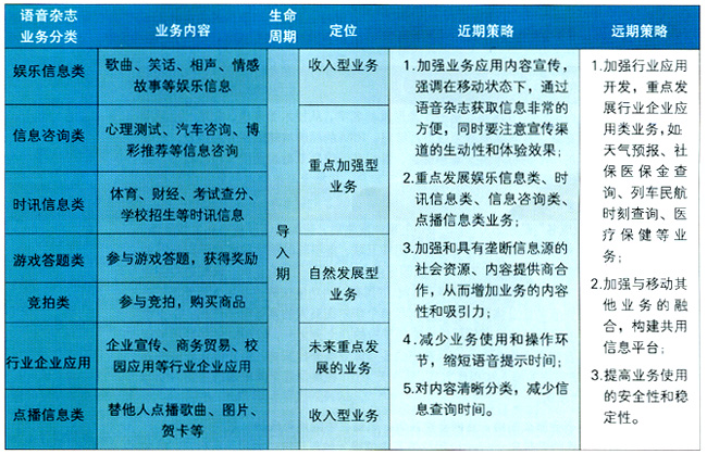 - 時(shí)訊信息類和信息咨詢類業(yè)務(wù),IVR優(yōu)勢(shì)較強(qiáng),但業(yè)務(wù)范圍較窄,內(nèi)容較少,收入貢獻(xiàn)較低,同時(shí)部分業(yè)務(wù)容易受到SP信息源的制約。如果能進(jìn)一步完善服務(wù),滿足用戶需求,業(yè)務(wù)將迅速發(fā)展,應(yīng)該定位于IVR短期發(fā)展的重點(diǎn)業(yè)務(wù)。