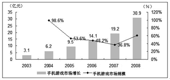 國內(nèi)手機游戲市場在過去的幾年里呈現(xiàn)快速發(fā)展的趨勢。2004年增長率接近100%,2005年也有50%以上的增長。但最近兩年國內(nèi)整個手機游戲市場隨著手機普及率的增速放緩也進入了盤整期。iResearch咨詢估計,從2005年至2007年,國內(nèi)手機游戲市場的收入規(guī)模盡管仍然處于上漲趨勢,但年增長率逐年下降,2008年后隨著市場環(huán)境更加成熟理性,年增長率將會出現(xiàn)反彈,升至60%以上。