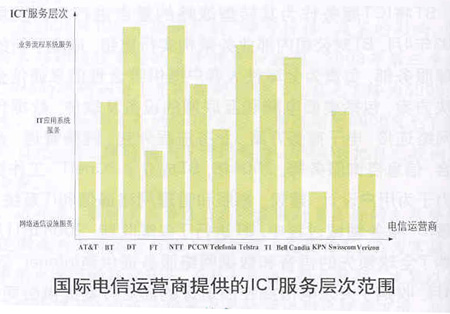 ICT服務的范圍大致可分為三個層次,一是面向網絡通信設施(包括網絡規(guī)劃、網絡系統集成、外包管理等)的服務,二是面向IT應用系統(包括軟件系統支持與維護、系統集成、應用托管等)的服務,三是面向業(yè)務流程系統(包括系統咨詢、業(yè)務流程外包等)的服務。從客戶視角來看,第三種服務的層次最高,第一種服務的層次最低,而電信運營商提供的ICT服務層次越高,則表明其在該領域拓展的范圍越廣。上述國際電信運營商提供的ICT服務層次范圍如下圖所示。