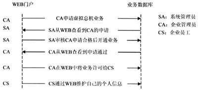 虛擬總機系統(tǒng)開戶流程采用WEB方式實現(xiàn),以此完成用戶對虛擬總機業(yè)務(wù)的定購、系統(tǒng)管理員對用戶開戶申請的審核、用戶業(yè)務(wù)參數(shù)的控制等操作,最后企業(yè)員工可以在企業(yè)管理員許可業(yè)務(wù)后,登陸WEB門戶管理個人信息。具體流程如圖2所示。