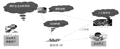 步驟五:如果用戶不知道員工分機號碼或者希望了解其他信息,主叫用戶可以選擇接入人工秘書臺。此時人工秘書臺會依據(jù)被叫號碼檢索出被呼叫集團的信息,同時根據(jù)主叫號碼檢索出主叫用戶是否為企業(yè)內(nèi)部員工或者企業(yè)客戶,同時將這些信息同步更新到人工秘書臺上,話務(wù)員根據(jù)這些信息可以完成作為企業(yè)特色話務(wù)員的服務(wù)工作;