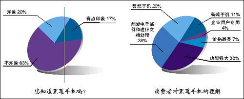 根據(jù)調(diào)查結(jié)果,目前國(guó)內(nèi)知道黑莓手機(jī)的消費(fèi)者僅占20%,有63%的消費(fèi)者從沒有聽說(shuō)過“黑莓”這個(gè)名字,還有17%的消費(fèi)者只是有點(diǎn)印象。