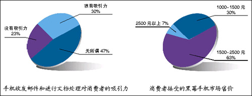 另一個(gè)調(diào)查項(xiàng)目展現(xiàn)了這個(gè)問題的另一面。調(diào)查顯示,只有28%的消費(fèi)者知道黑莓手機(jī)的核心功能是郵件的Push功能和在線文件處理。并且,在這些人中,83%的人認(rèn)為這個(gè)功能的收費(fèi)令他們無(wú)法接受。
