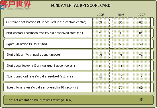 一次問題解決率的記分已經(jīng)作為定義和測量標(biāo)準(zhǔn)擁有了更高的協(xié)調(diào)性,但是人工座席利用率,生產(chǎn)力的代名詞,應(yīng)該受到更多的關(guān)注,因為它是合理規(guī)劃和管理資源的一個重要體現(xiàn)。員工離職率測評的是平均年流失率,是檢測人力資源管理效率的一項重要指標(biāo)。除了像處理今年24%的流失率所付出的高成本和努力外,客戶服務(wù)的間接成本也是值得注意的。員工曠工對企業(yè)來說是無法計算的損失。注重激情,提高滿意度和激發(fā)員工的主動性是解決這項問題的關(guān)鍵點。電話放棄率統(tǒng)計顯示有十分之一的來電者會放棄再次來電,因此呼叫中心要滿足客戶的期望還有很長的路要走。接聽速度的記分統(tǒng)計中10秒的接聽記錄有所下降,但是20秒的接聽標(biāo)準(zhǔn)有整體的提高。生產(chǎn)小時成本是計算提供特定服務(wù)實際成本的標(biāo)準(zhǔn)尺度,同時也是了解呼叫中心每個生產(chǎn)小時所需的投資成本的重要依據(jù)。