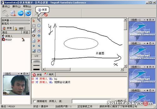 可以看到該系統(tǒng)提供了多路視頻展示與共享文檔顯示區(qū)、文本交流、文檔共享、語音交流等多種交互手段,各用戶可以在主席的協(xié)調(diào)下使用各項(xiàng)功能輕松地實(shí)現(xiàn)實(shí)時(shí)交流與網(wǎng)絡(luò)協(xié)作。