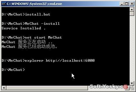 說明:MeChat目錄中還有一個(gè)Run、bat,該文件用于測試MeChat服務(wù)器。假如安裝MeChat時(shí)Run、bat的命令窗口還開著,則務(wù)必先關(guān)閉此窗口再執(zhí)行install、bat。另外,雙擊執(zhí)行該目錄下的uninstall、bat批處理文件可以停止并刪除系統(tǒng)中的MeChat服務(wù)。