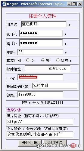 單擊首頁中的“用戶注冊(cè)”,然后在彈出的用戶注冊(cè)頁面中輸入用戶名、密碼、性別等信息(如圖24所示),單擊“開始注冊(cè)”即告完成。