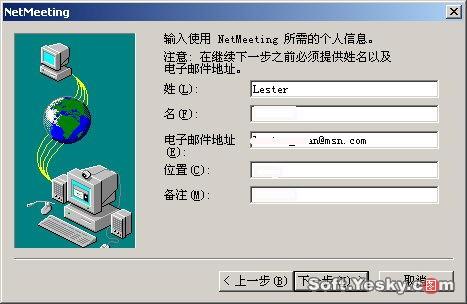 首次運(yùn)行Netmeeting,軟件會(huì)出現(xiàn)一個(gè)向?qū),要求?duì)用戶信息進(jìn)行簡單的設(shè)定,單擊下一步,輸入個(gè)人信息,如圖4所示: