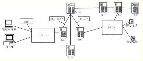 隨著用戶規(guī)模的擴(kuò)大以及用戶對業(yè)務(wù)需求的增長,網(wǎng)關(guān)在規(guī)模上要不斷擴(kuò)大。集中型的網(wǎng)關(guān)結(jié)構(gòu)在可擴(kuò)展性、安全性以及組網(wǎng)的靈活性方面的不足日益顯露出來。因此,將業(yè)務(wù)、控制和信令分離的概念被提了出來,即將IP電話網(wǎng)關(guān)分離成三部分:信令網(wǎng)關(guān)(SG)、媒體網(wǎng)關(guān)(MG)和媒體網(wǎng)關(guān)控制器(MGC)。SG負(fù)責(zé)處理信令消息,將其終結(jié)、翻譯或中繼;MG負(fù)責(zé)處理媒體流,將媒體流從窄帶網(wǎng)打包送到IP網(wǎng)或者從IP網(wǎng)接收后解包并送給窄帶網(wǎng);MGC負(fù)責(zé)MG資源的注冊、管理以及呼叫控制。在這種分布式網(wǎng)關(guān)體系結(jié)構(gòu)中,MG和MGC之間采用H.248協(xié)議,SG和MGC之間采用SIGTRAN協(xié)議。