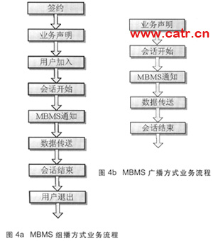 MBMS可應用組播模式和廣播模式兩種業(yè)務模式。廣播模式接近于數字電視業(yè)務,而組播模式專注和定位于群業(yè)務。組播模式提供了更好的計費特性,包括服務訂閱、接入和推出功能,需要用戶簽約相應組播組,進行業(yè)務激活,并產生相應的計費信息,而廣播業(yè)務不需要小區(qū)中所有用戶都制定該業(yè)務便可以獲得。由于組播和廣播模式在業(yè)務需求上存在不同,導致其業(yè)務流程也不同(見圖4a、圖4b)。