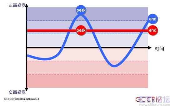紅色情感曲線代表旨在提供全面理想體驗(yàn)的傳統(tǒng)方法。藍(lán)色情感曲線反映的是一種資源分配的新方法,它專注于峰值和終了這兩個(gè)關(guān)鍵點(diǎn)同時(shí)將剩余子流程的表現(xiàn)控制在平均水平之下?此菩瘦^低的那個(gè)(藍(lán)色情感曲線)