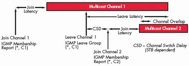 TV節(jié)目通常采用組播方式進(jìn)行傳送。組播是一種允許一個(gè)或多個(gè)發(fā)送者(組播源)一次同時(shí)發(fā)送單一的數(shù)據(jù)包到多個(gè)接收者的網(wǎng)絡(luò)技術(shù)。組播源把數(shù)據(jù)包發(fā)送到特定組播組,而只有屬于該組播組的地址才能接收到數(shù)據(jù)包。在IPTV里,組播源往往僅有一個(gè),即使用戶數(shù)量成倍增長,主干帶寬也不需隨之增加,因?yàn)闊o論有多少個(gè)目標(biāo)地址,在整個(gè)網(wǎng)絡(luò)的任何一條主干鏈路上只傳送單一視頻流,即所謂“一次發(fā)送,組內(nèi)廣播”。組播提高了數(shù)據(jù)傳送效率,減少了主干網(wǎng)出現(xiàn)擁塞的可能性。對于TV系統(tǒng)而言,其所能夠支持的用戶數(shù)目僅僅受到接入網(wǎng)絡(luò)能力的限制,與前端推送系統(tǒng)的推送能力無關(guān)。因此,TV業(yè)務(wù)性能的主要測試指標(biāo)包括所推送的最大頻道數(shù)目、頻道平均帶寬、平均頻道切換時(shí)間、I幀加入延時(shí)、平均頻道離開延時(shí)、平均頻道加入延時(shí)、頻道重疊時(shí)間和頻道間隔時(shí)間。