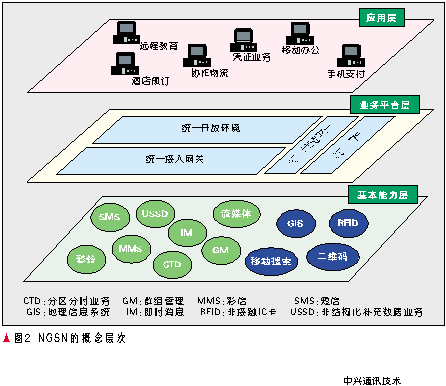 NGSN是為了適應網(wǎng)絡(luò)和技術(shù)的融合趨勢、運營商轉(zhuǎn)型的需求提出的,通過整合各種網(wǎng)絡(luò)業(yè)務(wù)能力,實現(xiàn)數(shù)據(jù)、業(yè)務(wù)、能力和管理的統(tǒng)一,從而能夠快速提供各種增值業(yè)務(wù)、協(xié)助運營商在價值鏈中處于主導地位。其概念層次如圖2所示。