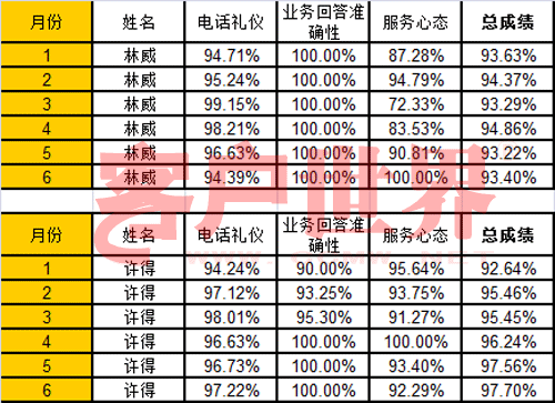 上面這兩張表格,是兩位員工的質(zhì)檢分?jǐn)?shù),從今年一月份開始,一月到六月每個(gè)月的質(zhì)檢分?jǐn)?shù),你看到有總分,還有三個(gè)分項(xiàng)的成績(jī)。請(qǐng)問,林威是新員工,還是許得是新員工?我們下一期公布答案。