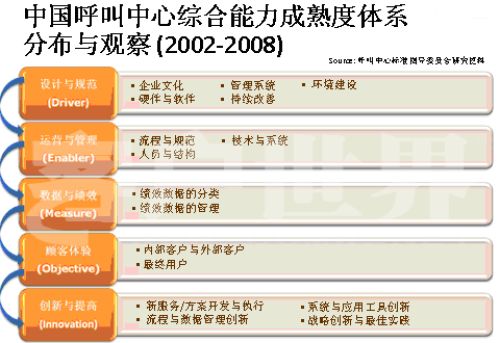 在過去幾年我們也做了很多研究,一個呼叫中心整合持續(xù)建設(shè)在哪些方面應(yīng)該做定義。基本上我們是分為五個方面,在每一級的成熟度方面,我們的呼叫中心都關(guān)注自己的成熟度。1、設(shè)計與規(guī)范;2、運(yùn)營管理;3、數(shù)據(jù)與績效;4、顧客體驗;5、創(chuàng)新與提高。第五方面創(chuàng)新與提高在CMM模型中是特有的,它在整個產(chǎn)業(yè)的發(fā)展過程中,提供戰(zhàn)略革新和戰(zhàn)略工具一體化使用的指導(dǎo)框架和最佳實踐。