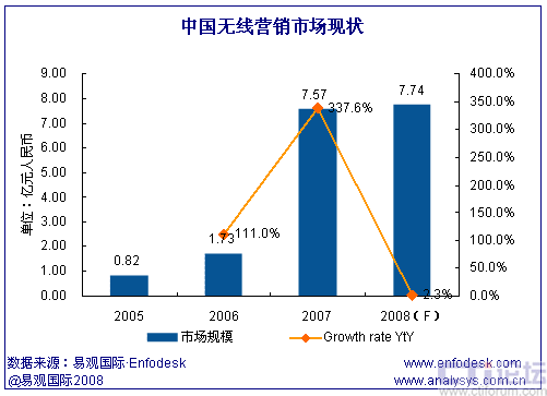 易觀國際(Analysys International)研究發(fā)現(xiàn),中國無線營銷市場經(jīng)過2007年的高速發(fā)展后,2008年已經(jīng)進入了商業(yè)模式探索階段,從市場規(guī)模上看,2008年全年無線營銷市場規(guī)模僅比上年增長2.3%。易觀國際(Analysys International)認為,無線營銷市場增速的明顯放緩主要由于短信廣告市場的萎縮,短信廣告是無線營銷市場最大的細分領(lǐng)域,2007年曾經(jīng)占整個無線營銷市場規(guī)模的72.7%。
