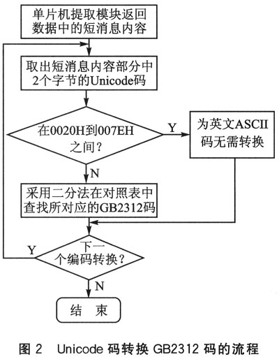 單片機(jī)通過串口與模塊連接后,發(fā)送讀取第一條新短消息指令:“AT+CMGR=1”。提取模塊接收的短消息后,先判斷其內(nèi)容是否為ASCII碼。若為ASCII碼,則無需轉(zhuǎn)換直接讀取;否則,通過查表法查找其對(duì)應(yīng)的漢字GB碼,實(shí)現(xiàn)不同編碼間的轉(zhuǎn)換。轉(zhuǎn)換流程如圖2所示。