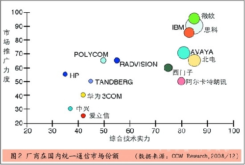 從當(dāng)前國內(nèi)統(tǒng)一通信市場競爭格局來看,在綜合技術(shù)實(shí)力方面,根據(jù)廠商所提供的統(tǒng)一通信解決方案中所能夠提供的各種溝通方式融合的程度以及每個(gè)具體功能技術(shù)水平等綜合因素考慮,處于前幾位的分別是思科、微軟、北電、IBM和Avaya,它們的產(chǎn)品線比較長,產(chǎn)品功能也相對(duì)比較全面。