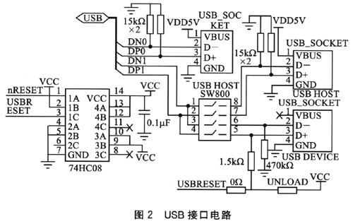 在ARM9開(kāi)發(fā)板內(nèi)部含有1個(gè)USB2.O接口控制器,接口電路如圖2所示。共有3個(gè)LISB接口(2個(gè)Host和1個(gè)Device),通過(guò)選擇開(kāi)關(guān)SW800進(jìn)行選通控制。74HC08作為4個(gè)二輸入與門(mén)邏輯電路,負(fù)責(zé)控制信號(hào)的邏輯組合。該接口用來(lái)連接USB接口的外部設(shè)備。