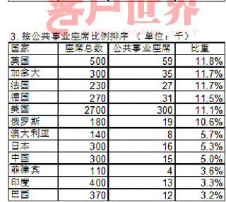 美國擁有全世界最多的座席,達到270萬個,公共事業(yè)座席30萬個,占11.1%;除美國以外,公共事業(yè)類座席總數(shù)排名在第2~6名的依次是:英國,加拿大,德國,法國,俄羅斯。