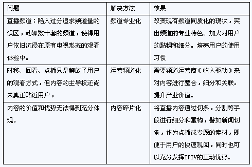 IPTV發(fā)展中,傳統(tǒng)視頻業(yè)務(wù)既是切入點(diǎn),同時(shí)也是業(yè)務(wù)收入的重要來(lái)源。但目前視頻業(yè)務(wù)的價(jià)值還未得到充分體現(xiàn);(dòng)性優(yōu)勢(shì)還未得到充分挖掘。