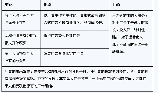 IPTV在短期內(nèi)的屬性還著重于電視媒體,在收入上偏向于后向媒體模式,通過(guò)用戶的流量來(lái)帶動(dòng)后向廣告價(jià)值。借助IPTV的互動(dòng)特性和頻道資源的豐富性,以空間來(lái)?yè)Q取稀缺的時(shí)間資源。