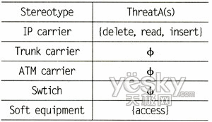 針對圖1中定義的定型以及對網(wǎng)絡(luò)安全構(gòu)成威脅的攻擊者的類型,可以定義出威脅函數(shù)TheatA(s)。其中A表示攻擊者類型,這里假定攻擊者為具備一般能力的外部攻擊者,即其可以竊聽到廣播信道上的數(shù)據(jù)流量,并可以插入或刪除數(shù)據(jù)流量,能夠利用系統(tǒng)漏洞入侵系統(tǒng);表示為模型中定義的定型威脅函數(shù)的值域?yàn)閧delete,read,insert,access}。根據(jù)NGN中承載網(wǎng)絡(luò)和計算節(jié)點(diǎn)的特性,我們可以得出如下威脅函數(shù),如表1所示。