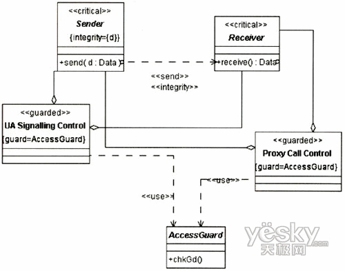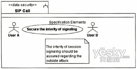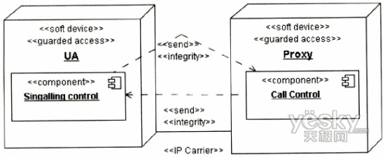 圖3中的UA代表UserA或UserB的UA,因?yàn)閮蓚UA的信令交互需要通過Proxy,且其安全需求是一致的,故在圖中只表現(xiàn)出一方。UA和Proxy均是基于通用計算平臺的節(jié)點(diǎn),其訪問控制需要受到保護(hù),故對其標(biāo)記上定型《guardedaccess》。UA中除處理信令外,還需處理媒體流的編解碼與控制,這個用例中只涉及信令的安全性,故在UA中只關(guān)注進(jìn)行信令控制的組件。UA與Proxy之間的通信基于IP承載,根據(jù)表1定義的威脅函數(shù):ThreatA(IP Carrier)={delete,read,insert},信令的完整性在攻擊下可能遭到破壞,需要采用相應(yīng)的安全機(jī)制對信令交互加以保護(hù)。